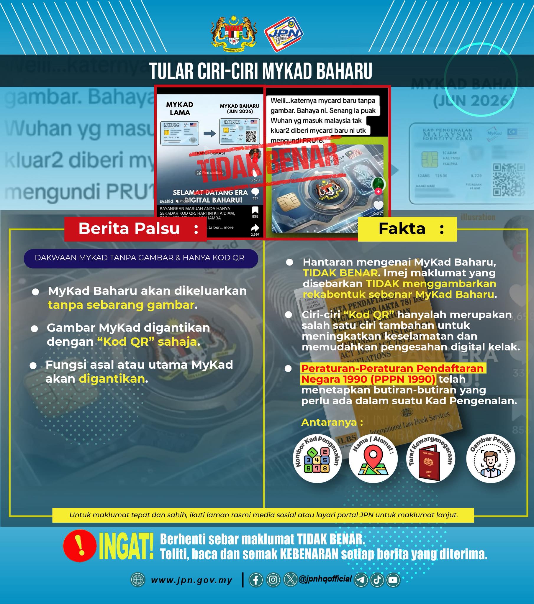 Dakwaan bahawa MyKad baharu akan dikeluarkan tanpa gambar dan hanya mempunyai Kod QR adalah TIDAK BENAR. Untuk pengetahuan anda, Peraturan-Peraturan Pendaftaran Negara 1990 (PPPN 1990) telah menetapkan bahawa setiap Kad Pengenalan hendaklah mempunyai butiran asas tertentu, antaranya:– Nombor Kad Pengenalan– […]