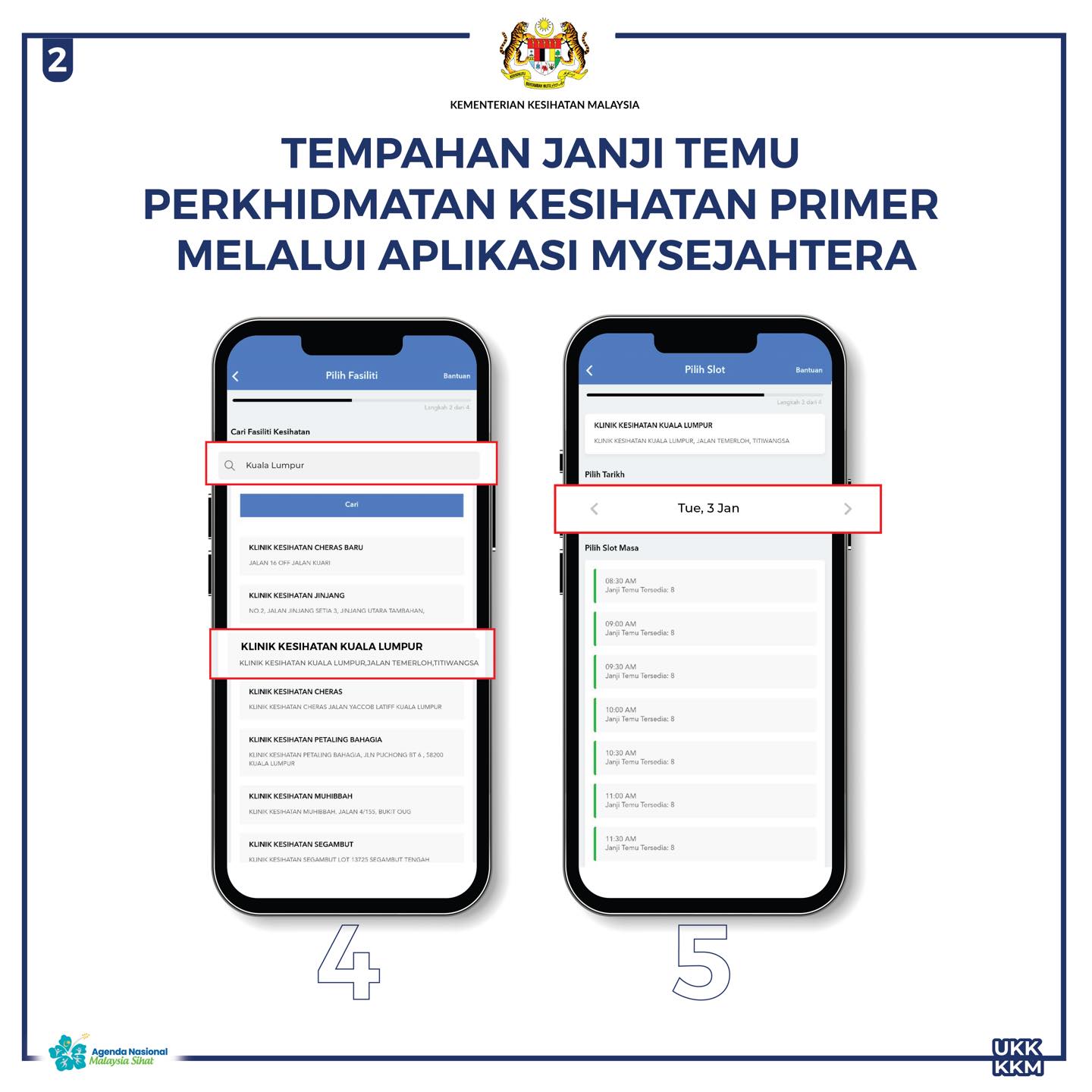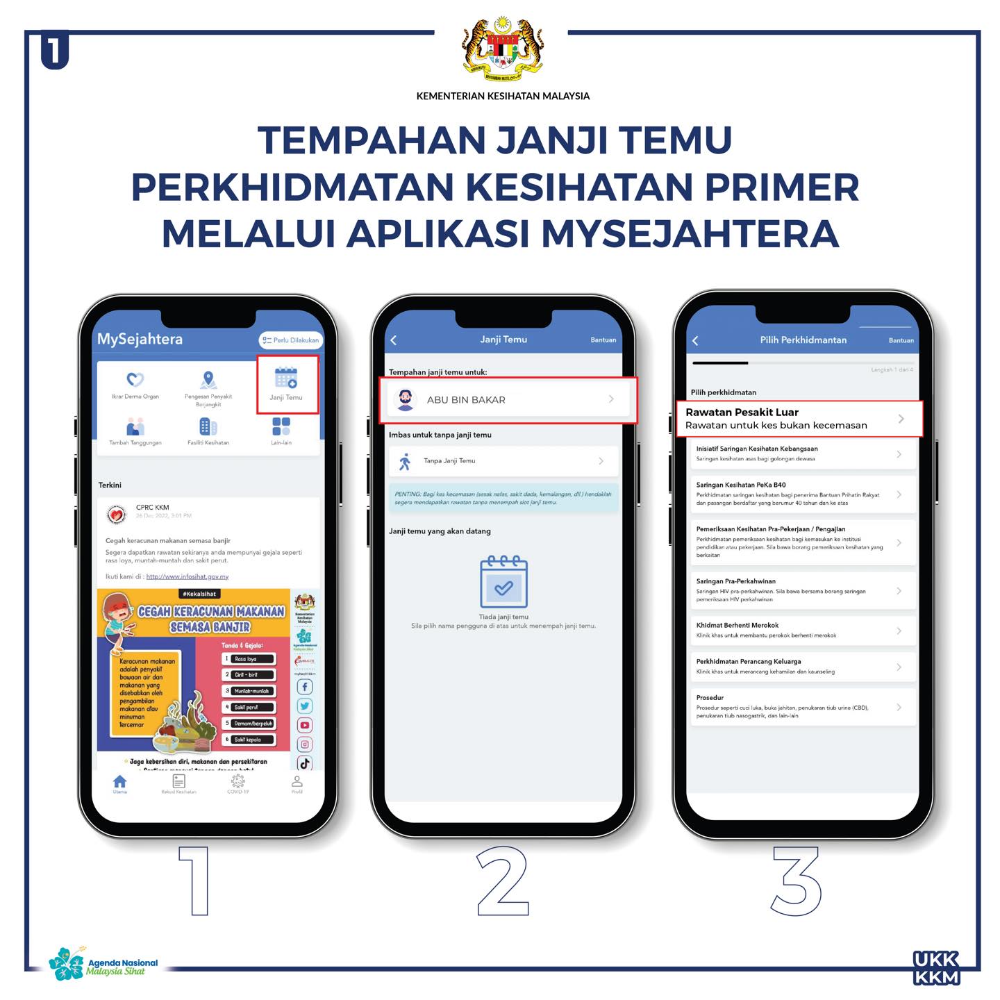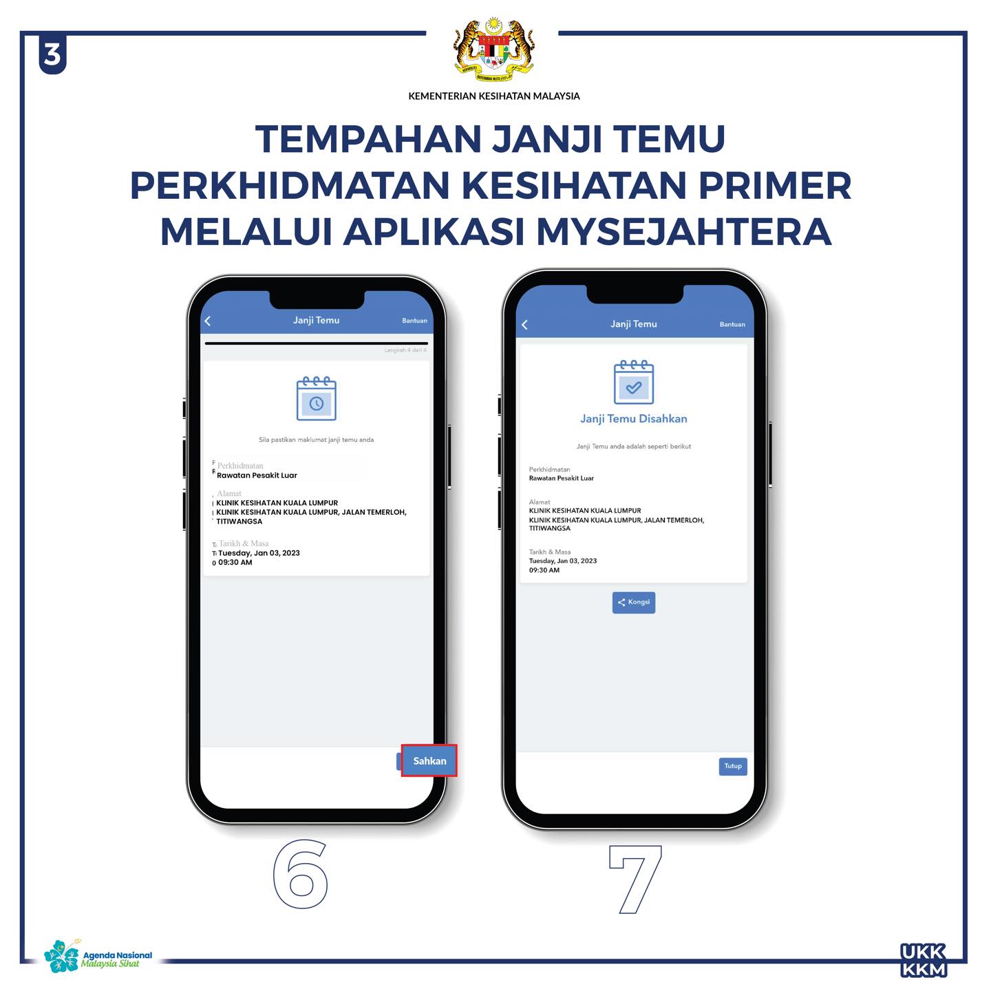 Berikut adalah langkah-langkah untuk janji temu perkhidmatan kesihatan primer diaplikasi MySejahtera.